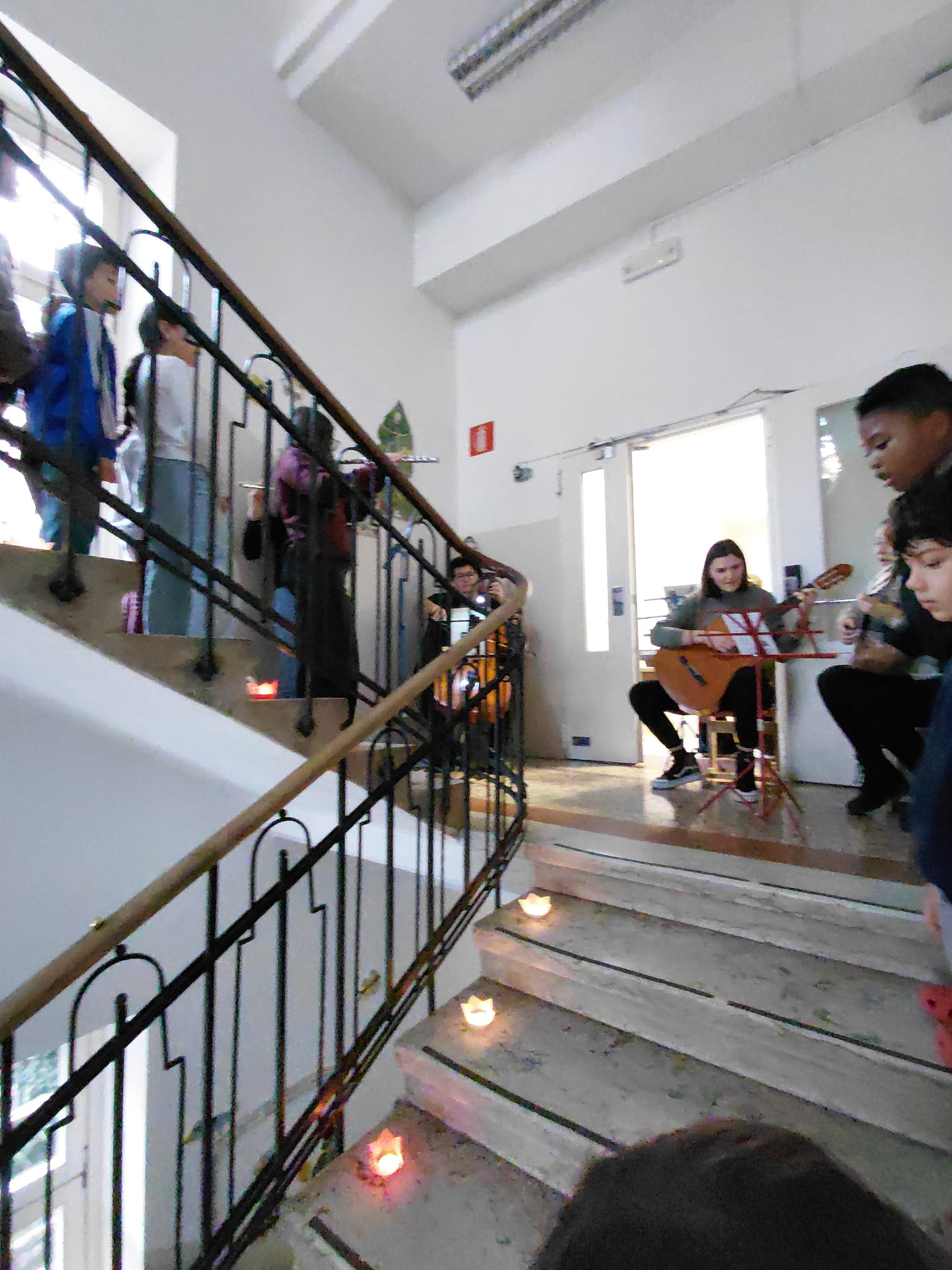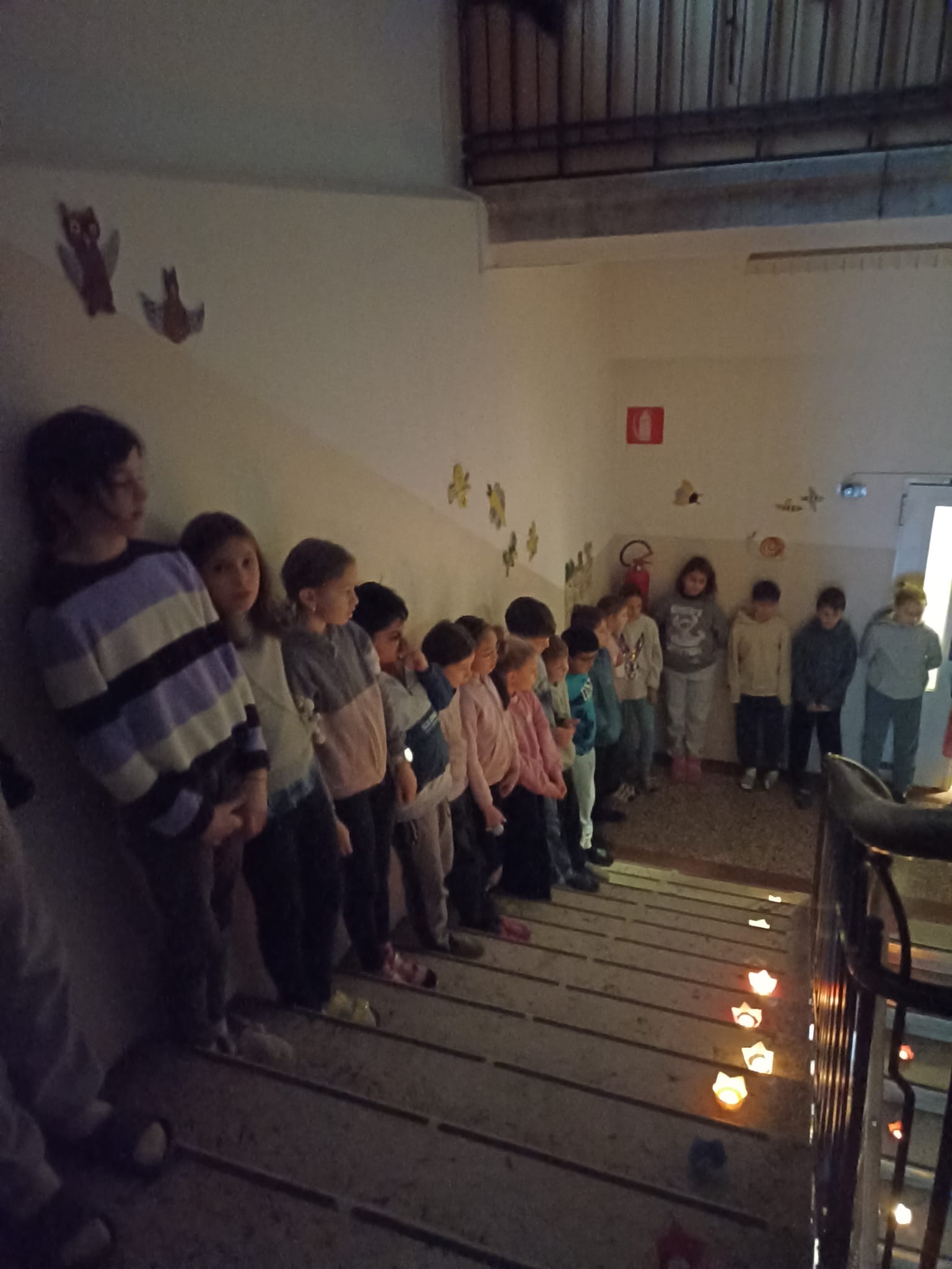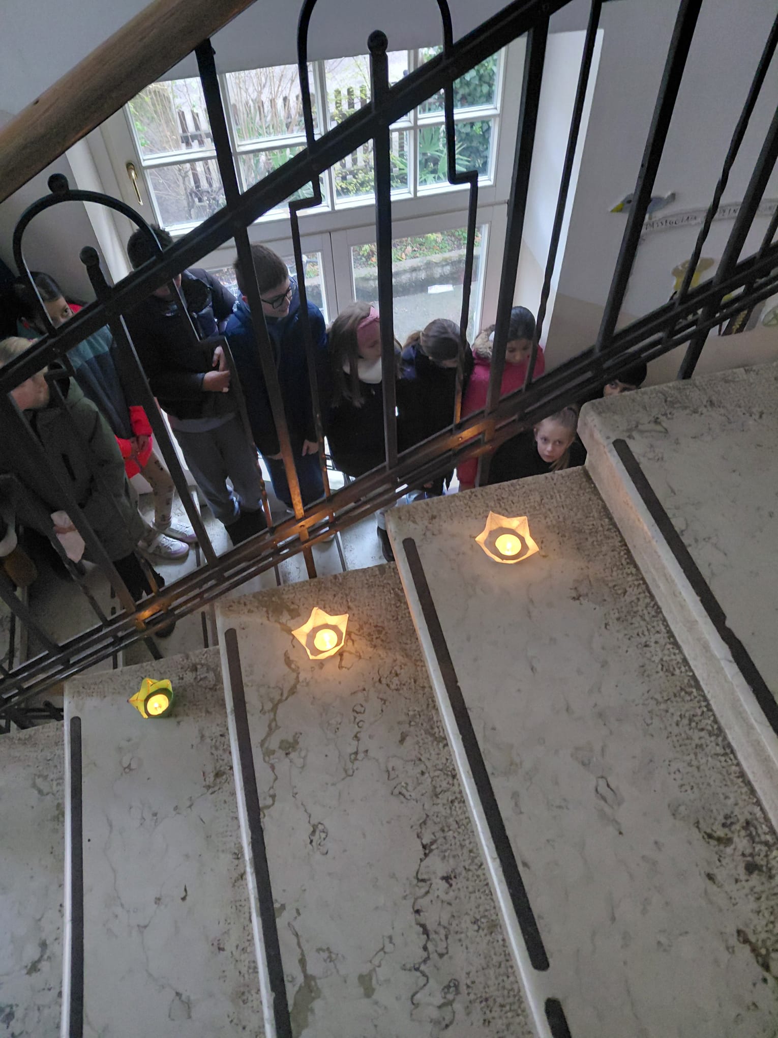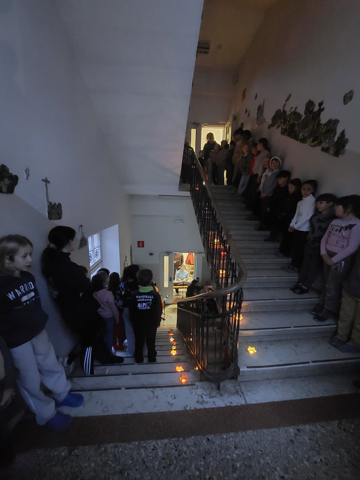 In der Adventszeit gibt an unserer Schule immer wieder besondere Aktivitäten. Eine sehr lange Tradition hat das „Singen im Treppenhaus“. Einmal in der Woche stellten sich alle Schülerinnen und Schüler um 8 Uhr morgens im, mit Teelichtern beleuchteten, Treppenhaus auf. Nach einem besinnlichen Instrumentalstück, das einige Lehrpersonen mit Cello, Gitarren, Keyboard und Querflöten vorbereitet hatten, wurden gemeinsam mehrere Weihnachtslieder gesungen.