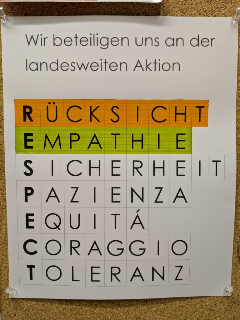 Im Rahmen unseres Erziehungs- und Organisationsplans legen wir im heurigen Schuljahr ein besonderes Augenmerk auf den Begriff RESPECT. Dieser steht für zentrale Werte, die das soziale Lernen stärken und ein respektvolles Miteinander an unserer Schule fördern sollen.