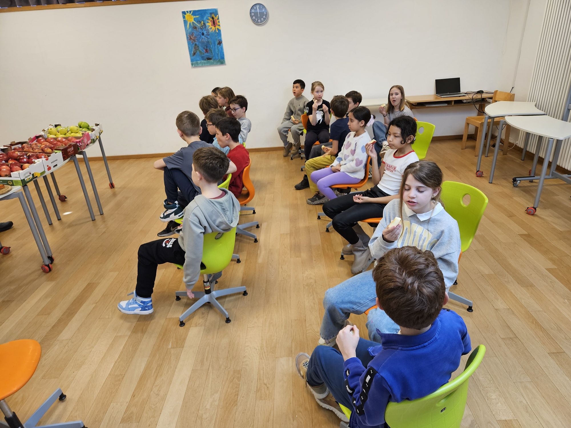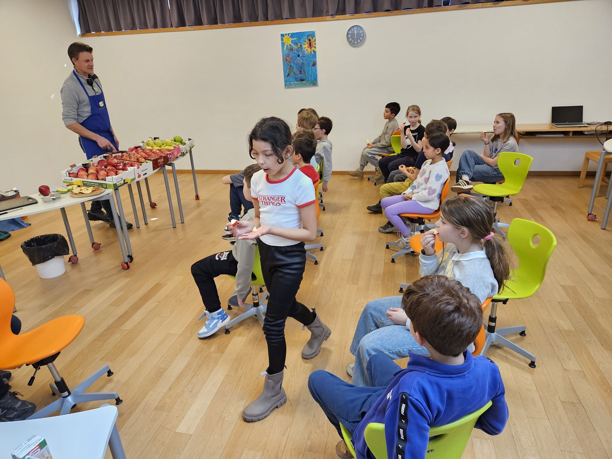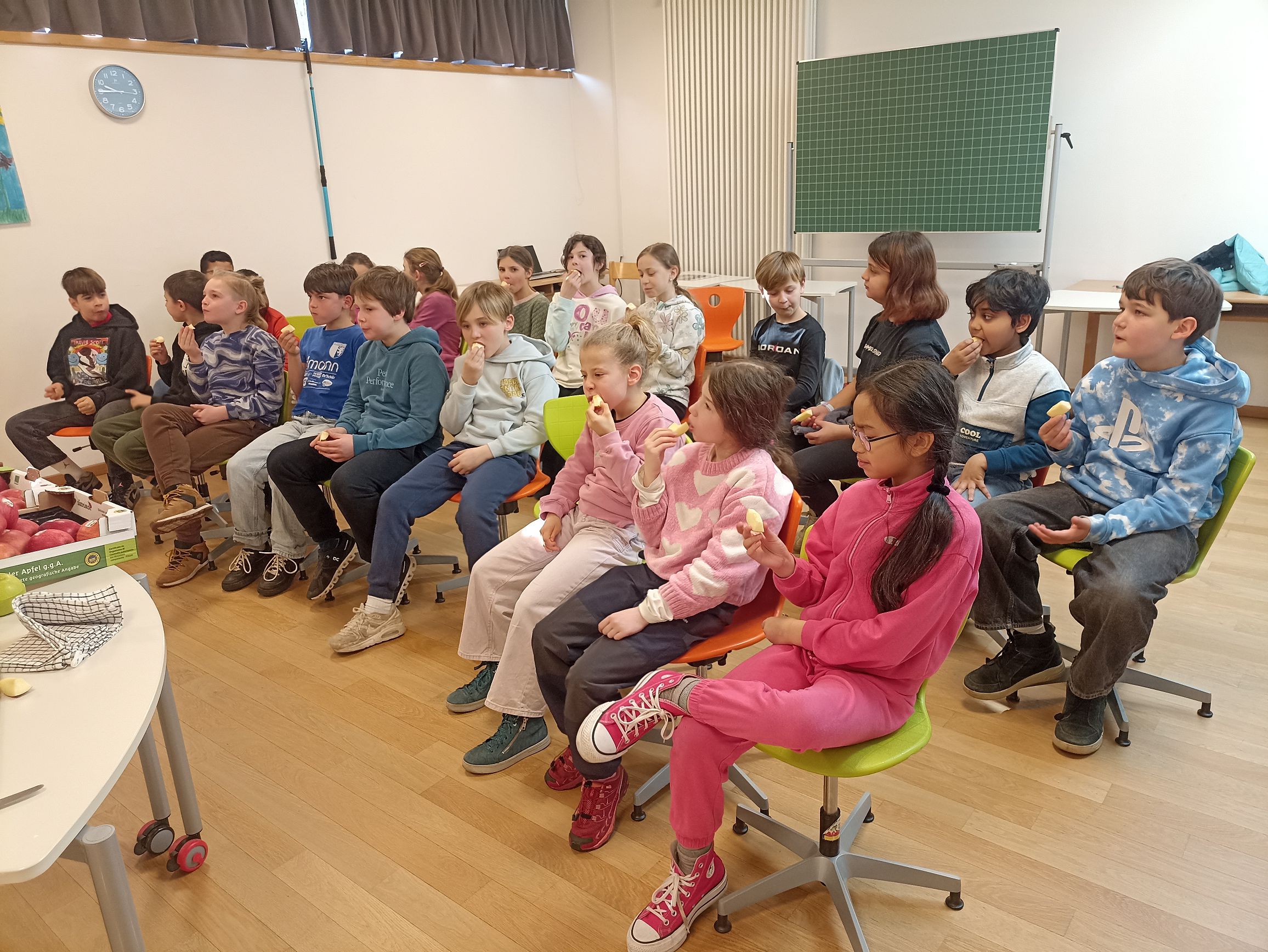 Das absolute Highlight des Projekts war natürlich die Apfelverkostung! Die Schülerinnen und Schüler durften verschiedene Sorten probieren und ihren Geschmack vergleichen. Verkostet wurden die Sorten Fuji, Gala, Envy, Pink Lady, Golden Delicious und Granny Smith.