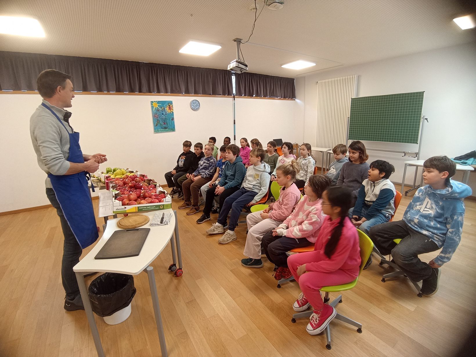 Im Rahmen des diesjährigen Apfelprojekts durften die Klassen 4A und 4B der Franz Tappeiner einen besonderen Gast begrüßen: Bauer Peter aus Gratsch.