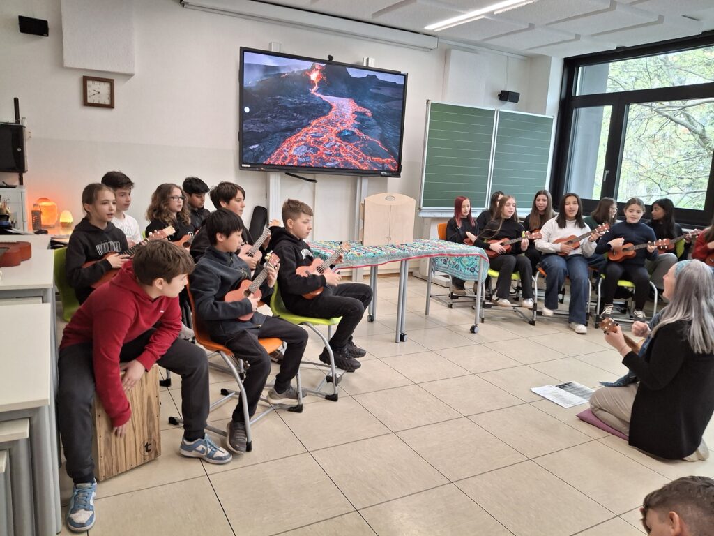 Am 26. März führten wir unseren Eltern ein Theaterstück und mehrere Ukulele-Lieder vor. Die Theaterpädagogin Frau Heidi Dubis besuchte uns im Unterricht und zeigte uns, wie man Geschichten erfindet und passende Bilder dazu gestaltet, die wir anschließend mit dem Kamishibai präsentieren konnten. Gleichzeitig übte Frau Prof. Alexandra Brunner mit uns verschiedene Ukulele-Stücke ein.