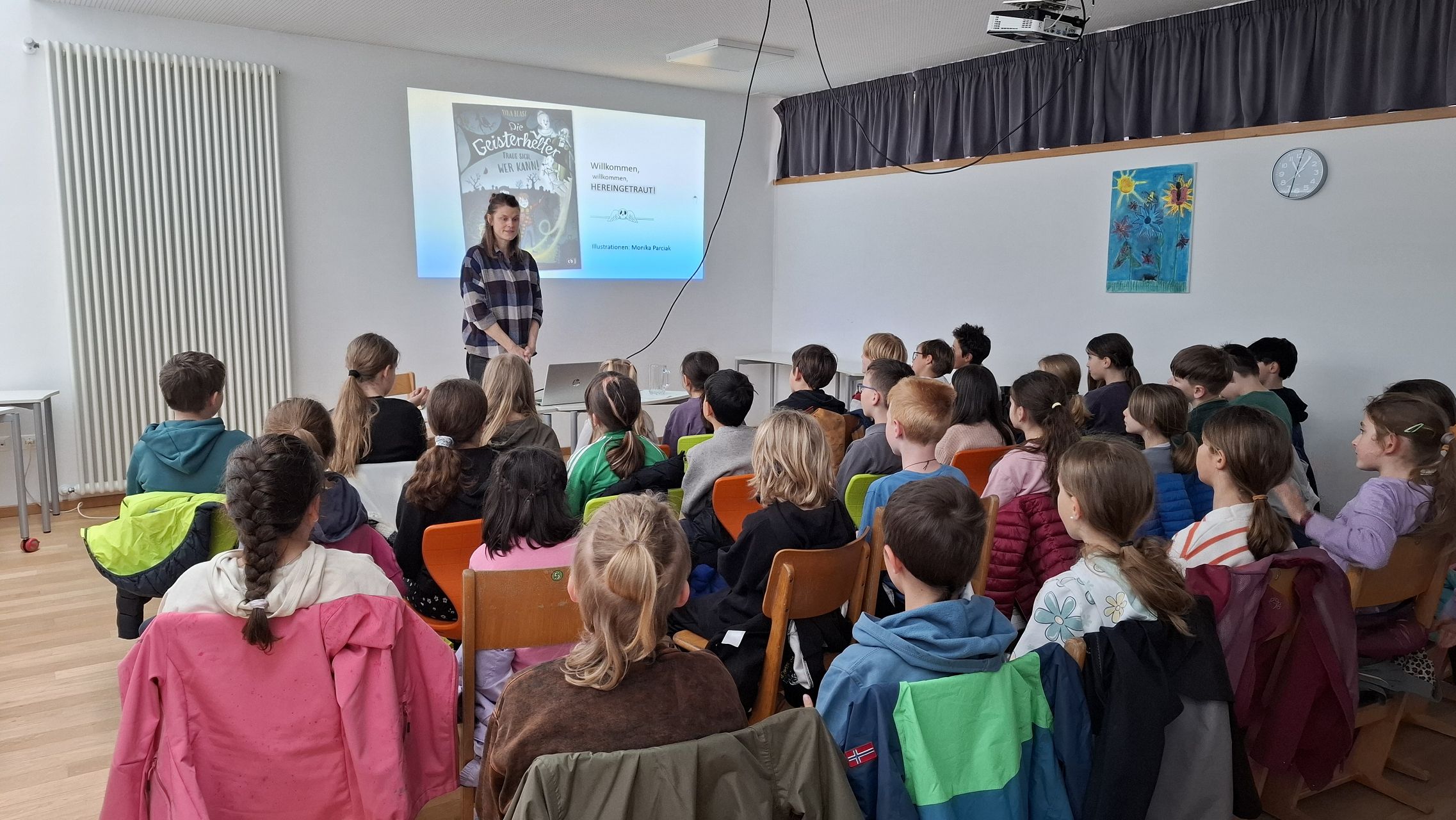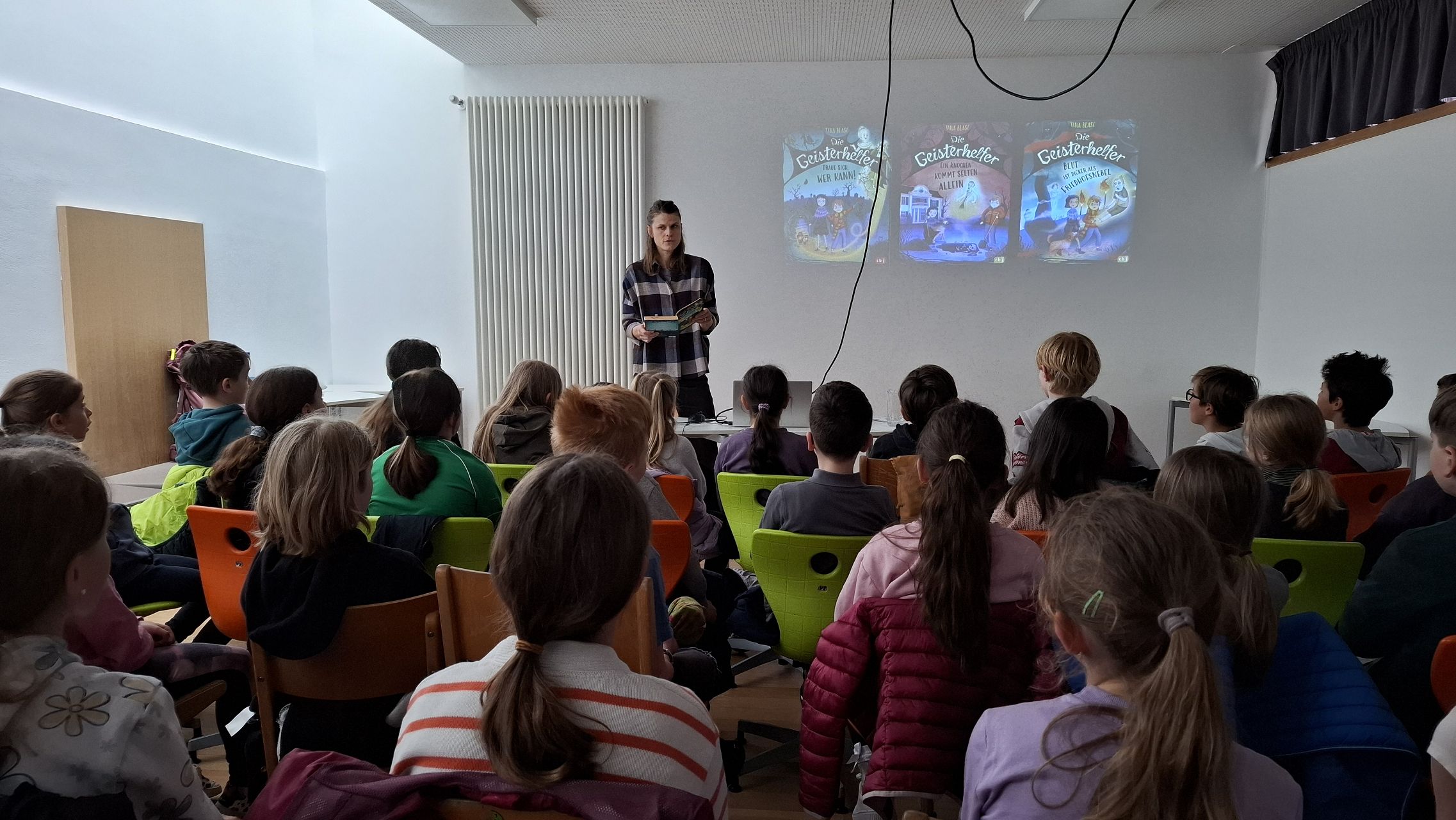 Die Autorin las aus ihrem Buch „Geisterhelfer – Trau sich, wer kann“ vor. Darin geht es um den Jungen Jan, der große Angst vor der Dunkelheit und vor Geistern hat. Eines Tages entdeckt er jedoch, dass er plötzlich mit Geistern sprechen kann – und das ausgerechnet auf einem Friedhof! Gemeinsam mit seiner mutigen Freundin stellt er sich seiner Angst und hilft den Geistern, ihre Probleme zu lösen. Dabei erleben die beiden viele aufregende und geheimnisvolle Abenteuer.