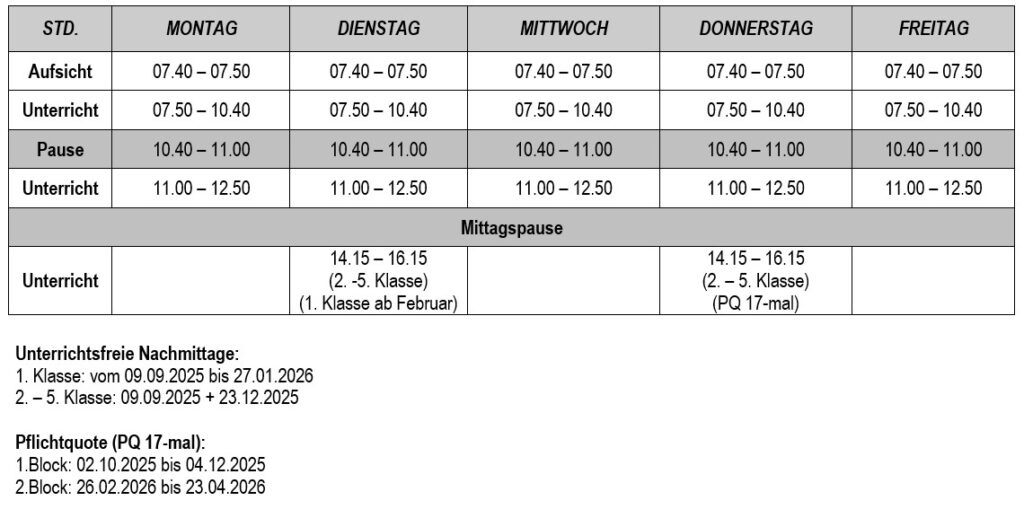 Unterricht | 11.00 – 12.50 | 11.00 – 12.50 | 11.00 – 12.50 | 11.00 – 12.50 | 11.00 – 12.50 |