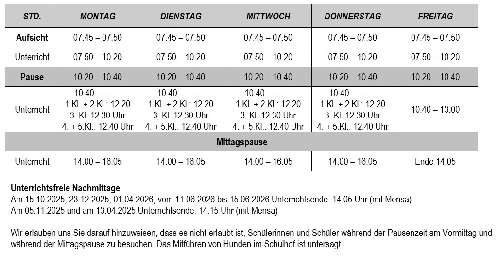 Am 15.10.2025, 23.12.2025; 01.04.2026, vom 11.06.2026 bis 15.06.2026 Unterrichtsende: 14.05 Uhr (mit Mensa)