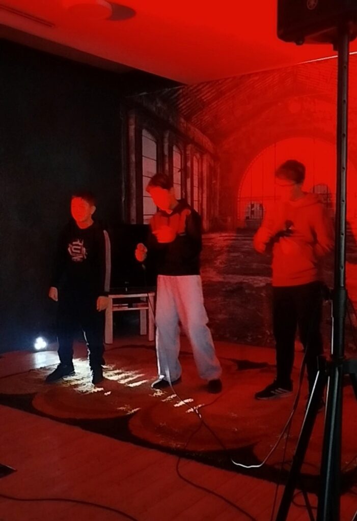 Die Klasse hatte sich mit der Jugendkultur Hip-Hop auseinandergesetzt. In Kleingruppen suchten die Schülerinnen und Schüler zunächst ein Thema aus. Anschließend schrieben sie einen passenden Text dazu, den sie dann zu einer bereits vorhandenen Hip-Hop-Melodie performten. Es kostete so manchen Schüler viel Mut, sich auf der Bühne mit Stimme und Bewegung zu präsentieren, zumal es für viele der erste Auftritt auf einer echten Bühne mit Mikrofon war. Dennoch meisterten alle ihren Auftritt bravourös und hatten dabei auch noch großen Spaß.