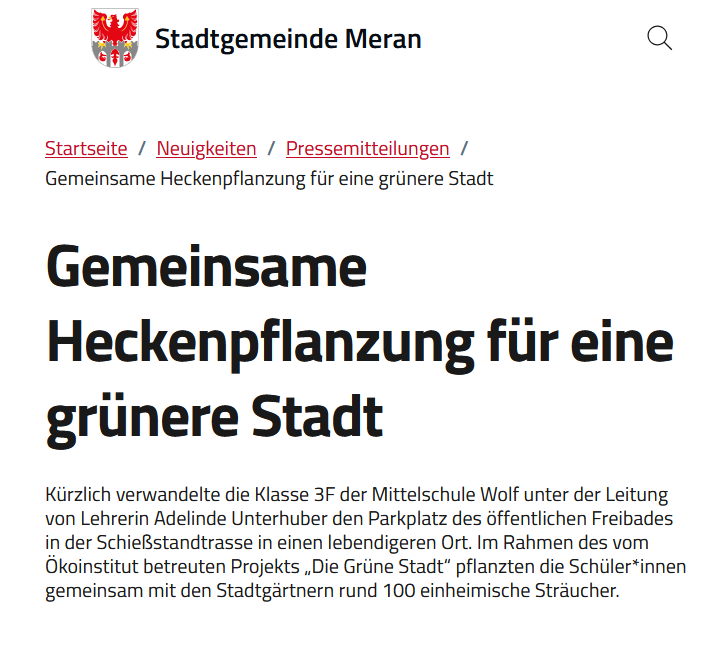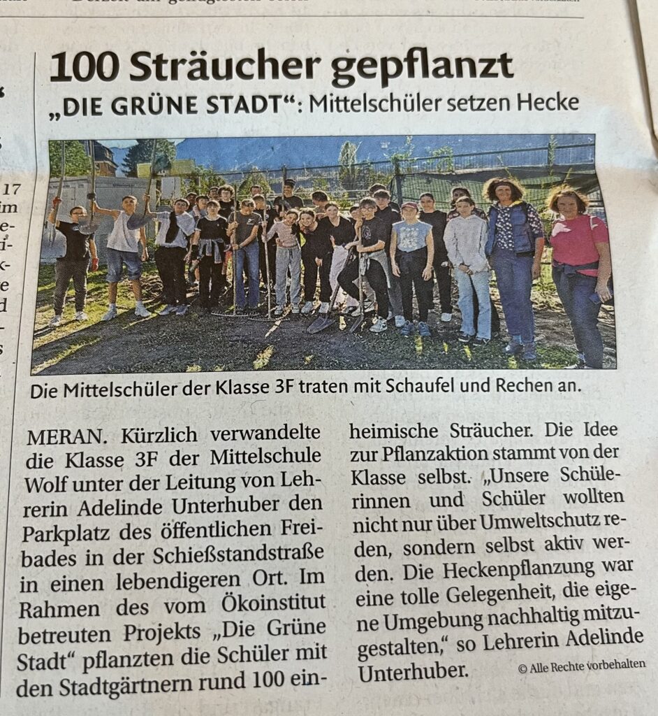 Die Klasse 3F der Mittelschule Wolf hat unter der Leitung von Lehrerin Adelinde Unterhuber den Parkplatz beim öffentlichen Freibad in der Schießstandtrasse in einen lebendigen Begegnungsort verwandelt. Im Rahmen des vom Ökoinstitut betreuten Projekts „Die Grüne Stadt“ pflanzten die Schüler*innen gemeinsam mit den Stadtgärtnern rund 100 einheimische Sträucher und setzten damit ein starkes Zeichen für mehr Natur im städtischen Raum.